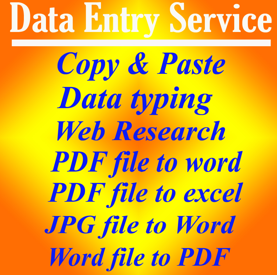Data copy paste Data typing Web research PDF file to word PDF file to exce JPG file to Word
