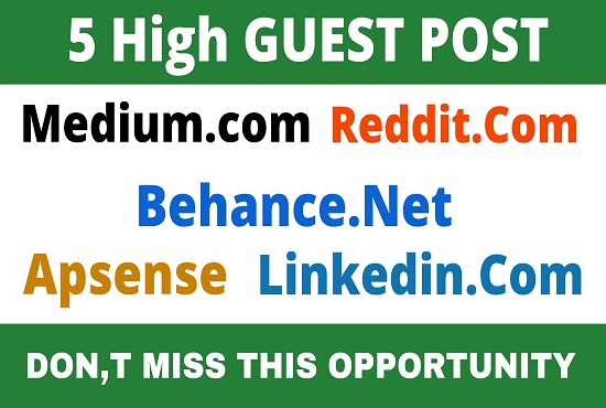 I will write 5x400+ words unique article and publish a 5 guest post on Medium, Reddit, Behance, Apsense, Linkedin with permanent backlinks. 5 high-authority guests post big brand sites with a backlink to your websites to add more search engine value to your website, this offer is a great opportunity for you.