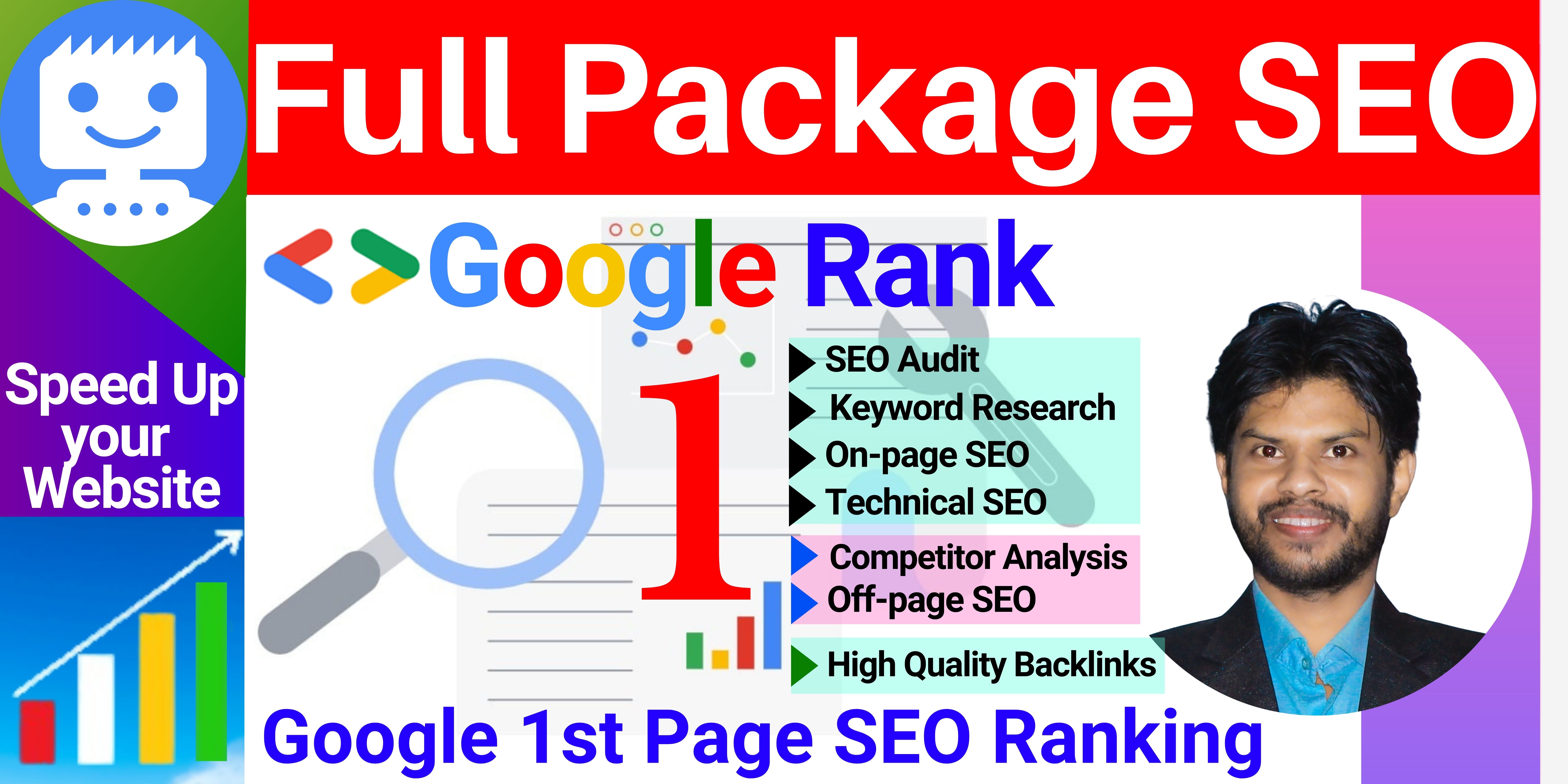 You will get a Full Package SEO service SEO Audit, On-page SEO, Off-page SEO