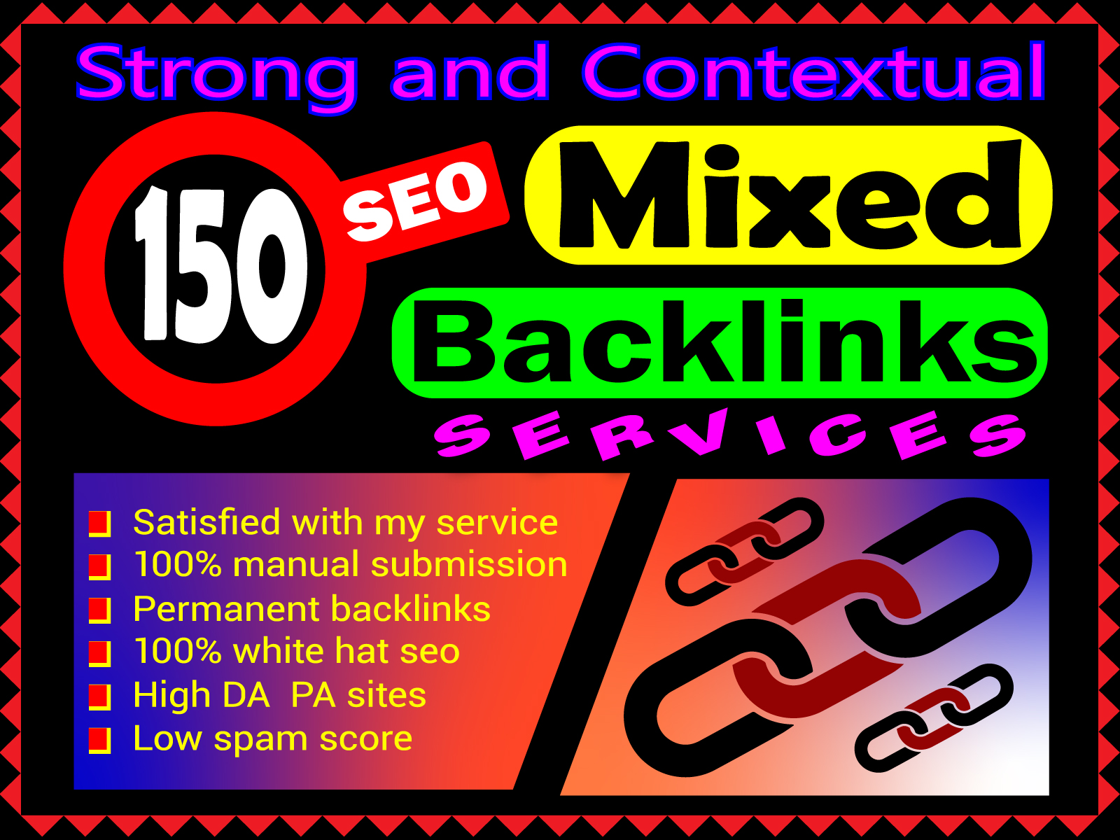 In this gig, I will provide you with 150 high-quality, relevant mixed backlinks for your website, which will help you improve your website's visibility and search engine ranking. These backlinks will be from various sources, such as social media, directories, forums, blogs, and other relevant websites. The backlinks that I provide will be manually created, and I will ensure that they are of the highest quality and relevance to your website. I will use only white hat SEO techniques to create the backlinks, which will help you avoid any penalties from search engines.