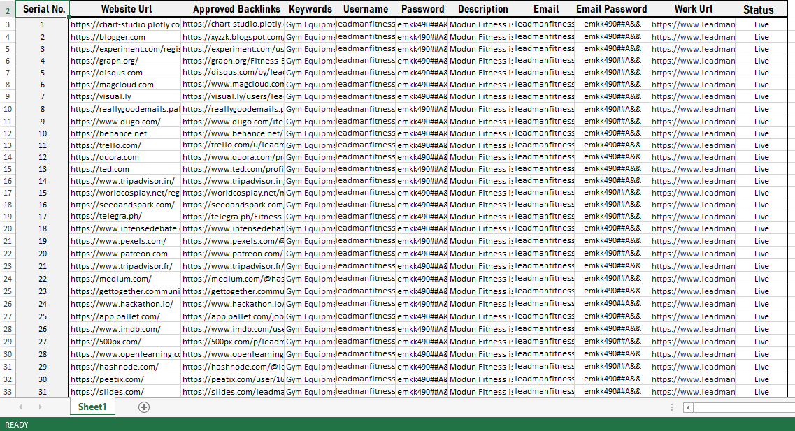Full report in Excel sheet with username, passwords, livelinks, and status.