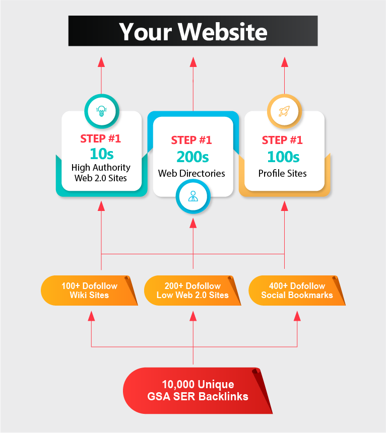 • To cap it off, I'll add 10,000+ unique GSA SER backlinks to the lower levels, further reinforcing the entire pyramid and pushing more link juice to your site.
