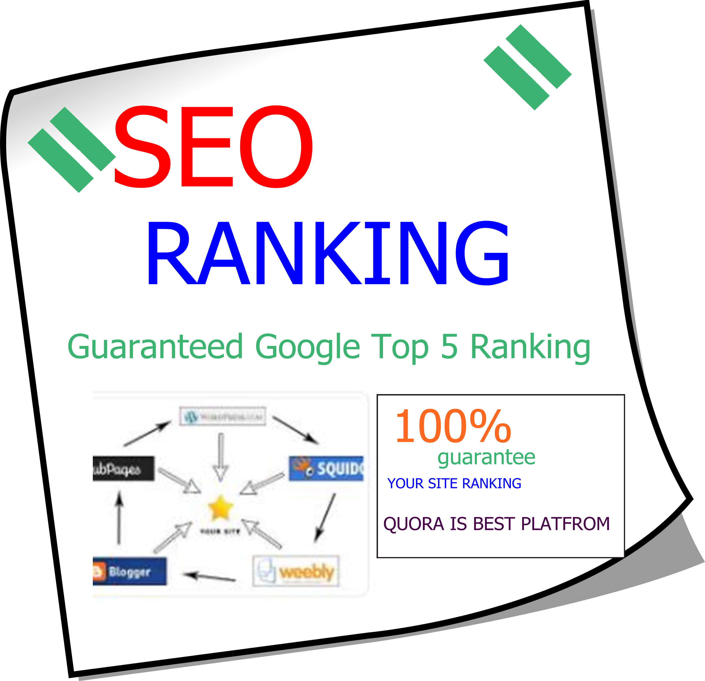 within days also. We will provide RankzUp SEO Service for Google Top 5Ranking with our White Hat SEO Strategy and with no question askedGuarantee. Send us 1 URL and 5 Keywords and look how your website growing. We