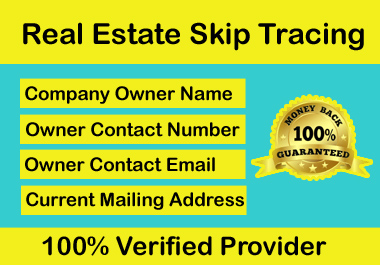 I want to help real estate investor, agent and wholesaler by my best skip tracing service. I m using TLO, LexisNexis, Intelius, Beenverified best skip tracing tools to find property owner company owner contact information. What I Need From You For Start Work: Owner Name if have . Full owner address or property address. More details if you want . Give me your data in Excel file or Google Spreadsheet. I ll provide the following info in Excel & Google Spreadsheets: 1-8 Personal Contact Wireless Landline Numbers. 1-3 Valid Personal Emails Address. Current Mailing Address if need . Note: Please first contact me, before placing an order to avoid confusion about Thanks