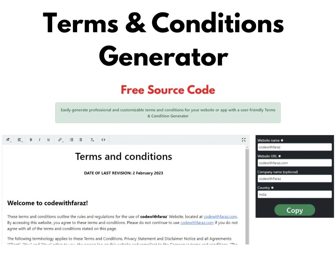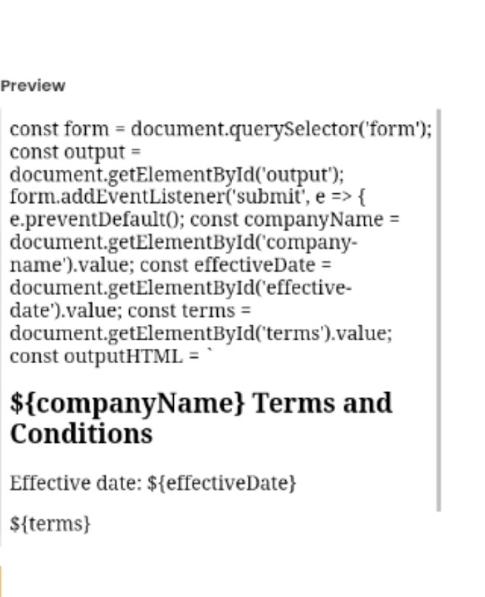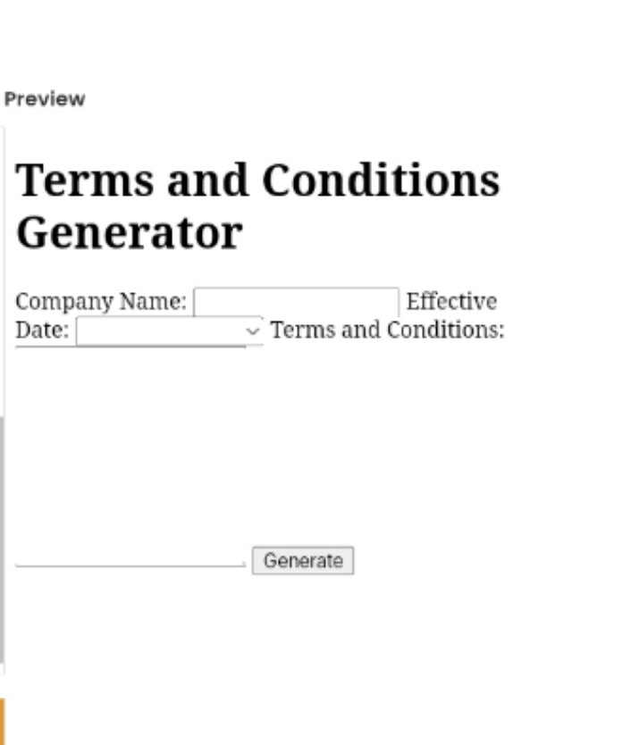 This is a fully responsive web page for generating customized terms and conditions for a company. Users can input their company name, effective date, and terms and conditions, and the page generates an HTML output with the information displayed in a clear and readable format. The page is designed with a clean and modern aesthetic using HTML, CSS, and JavaScript, making it user-friendly and accessible on various devices. This code can be a valuable tool for businesses or website owners who need to create legal agreements quickly and easily.