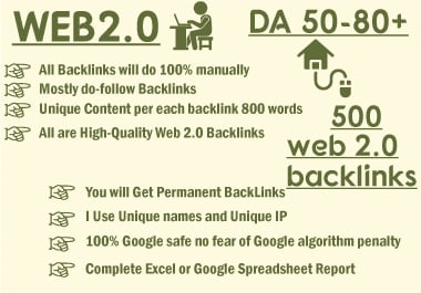 I will build Super Web 2.0 backlinks on WordPress, Blogger websites having 100-50 DA. 75% of the Links will be DO-Follow backlinks. Each article is published with an image, video, hyperlink pointing to a high authority site, and a contextual link to your site.