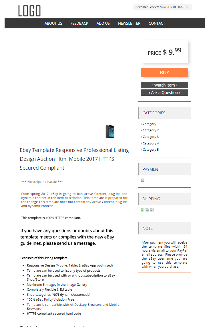 *** No script, no hassle ***From spring 2017, eBay is going to ban Active Content, plug-ins and dynamic content in the item description. This template is prepared for the change. This template does not contain any Active Content, plug-ins and dynamic content.