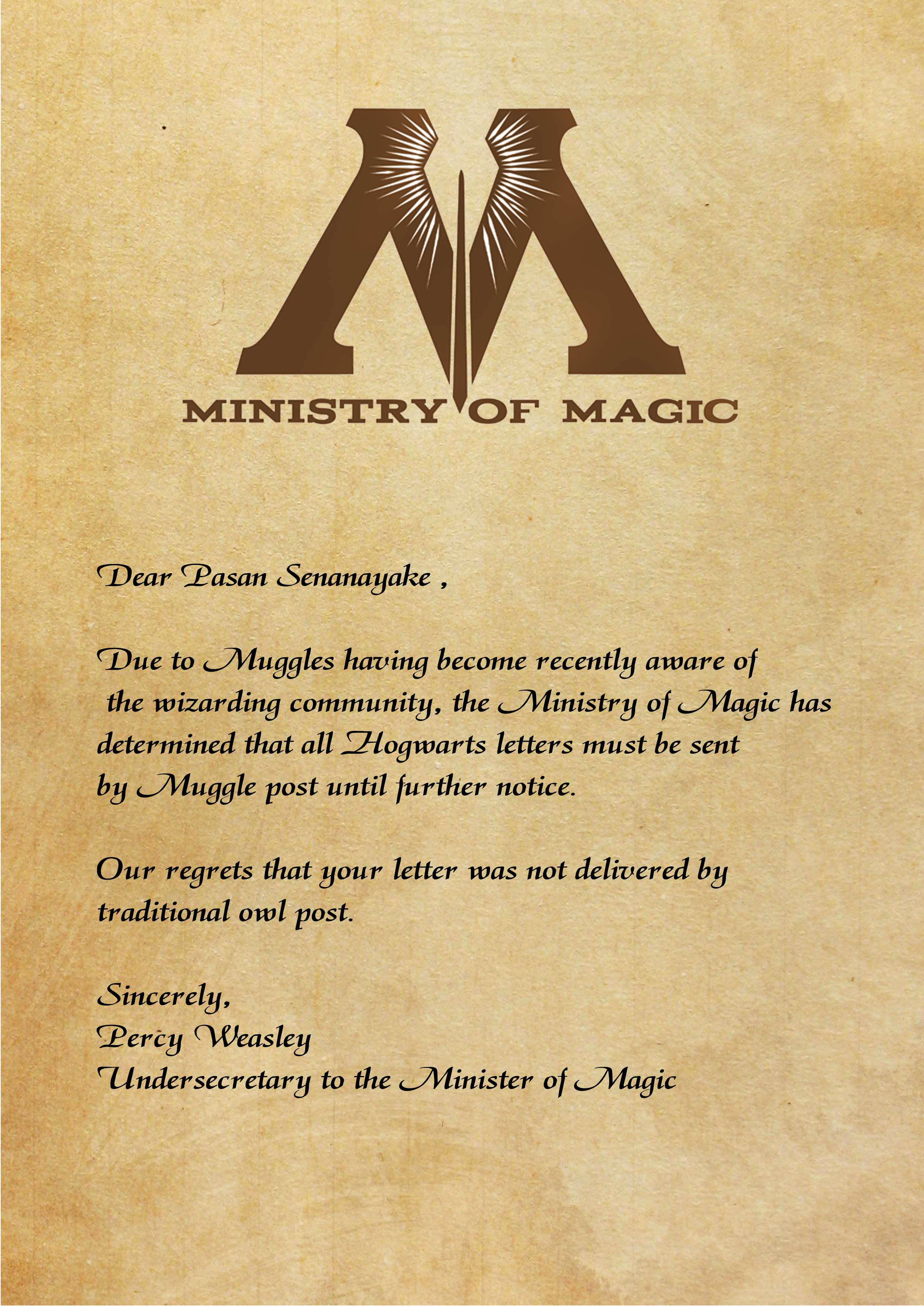 - ) Letter from Minister of Magic (explains why they are using muggle post instead of owl post)