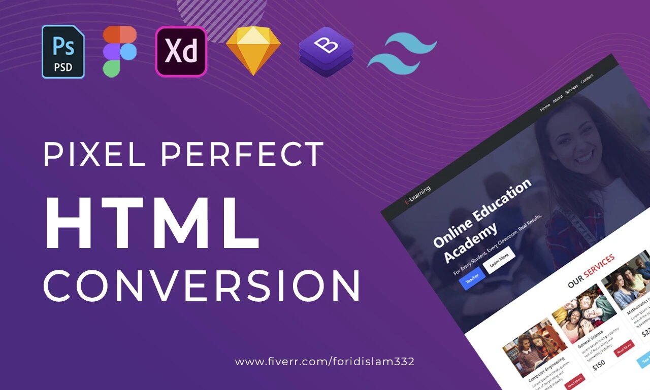 - PSD / Figma / XD / Sketch / JPG / PDF to HTML Conversion