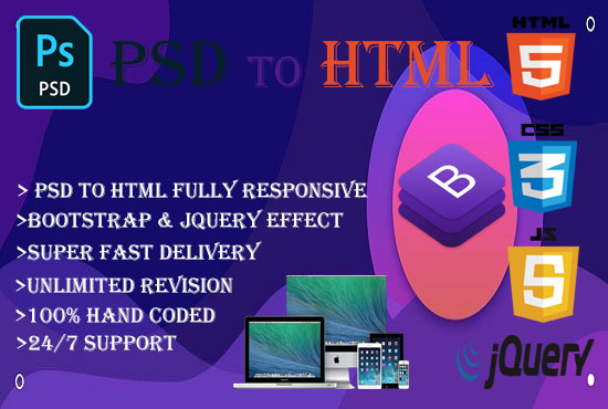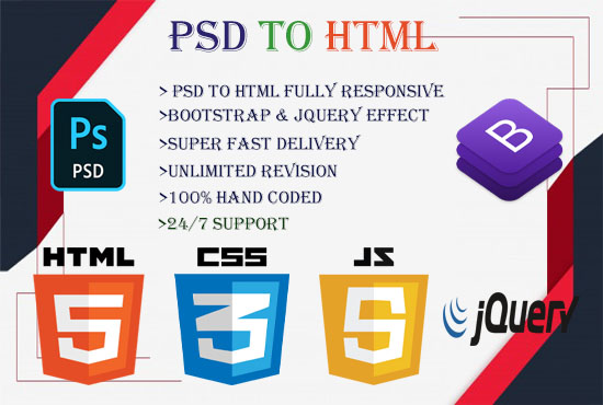 You have arrived at the appropriate place to convert your completed layout into HTML5 responsive with Bootstrap. I make convert PSD to HTML bootstrap, PSD to HTML CSS, PSD to Bootstrap, and HTML CSS with fully responsive. I'm always here to serve you as your Requirements.