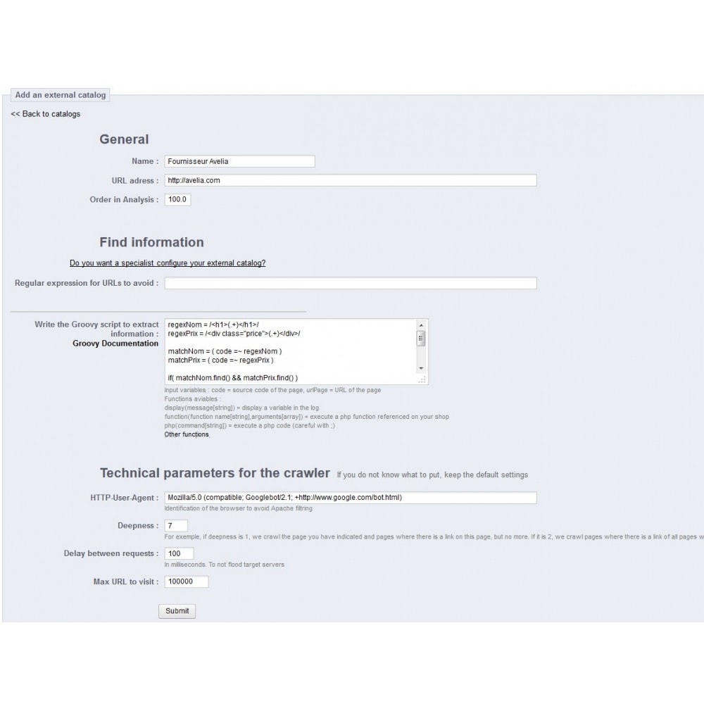 You must write the script in my module to extract information from an example site (http://*****.com) to send it to my prestashop shop for insertion (france********.com)
