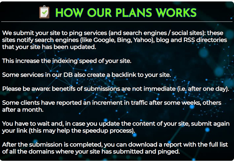 Your starter package will include over 1000 high quality sites,20 search engines,100 social/bookmarking sites and finally 5 EDU/GOV Sites.A great value if you ask us.