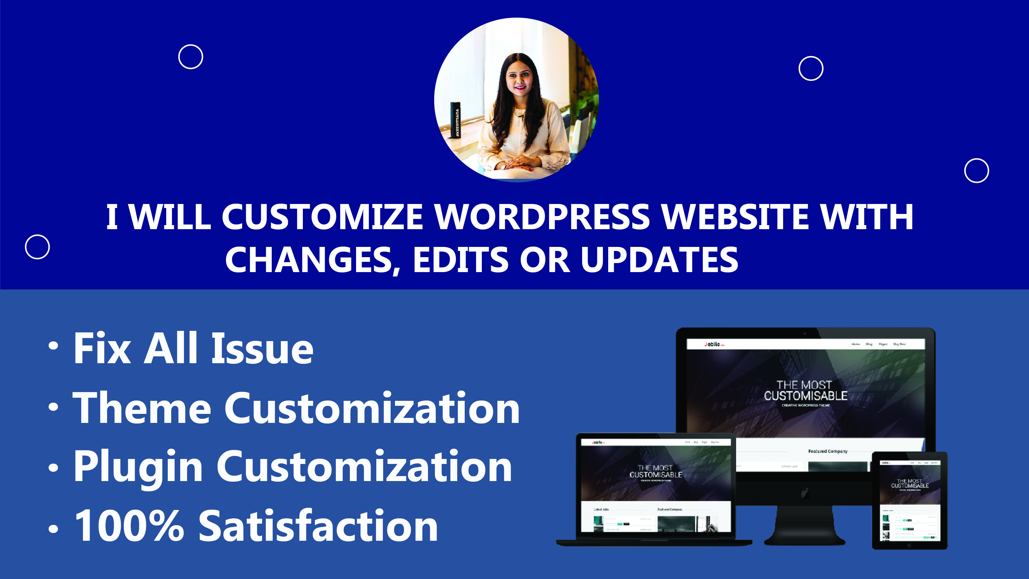 In this gig, I will customize the WordPress website with WordPress Changes, WordPress Edits or WordPress Updates.