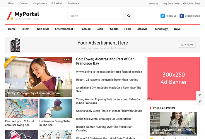 Recently, Happy themes released an all new WordPress theme named MyPortal that allow you to create a fully functional website for a news, newspaper, magazine, publishing or review site and it also comes with a responsive design means your site will look great on all types of devices such as iPad, iPhone, and Android devices. With easy to use theme customizer, you can easily customize every part of your site using the available stuff such as colors, setting and content and you can even preview those changes in the real – time. It is a Fousearch engine optimized theme and homepage featured content make it easy for you to highlight the important aspects of your blog. Some other features of this WordPress theme are as follows.
